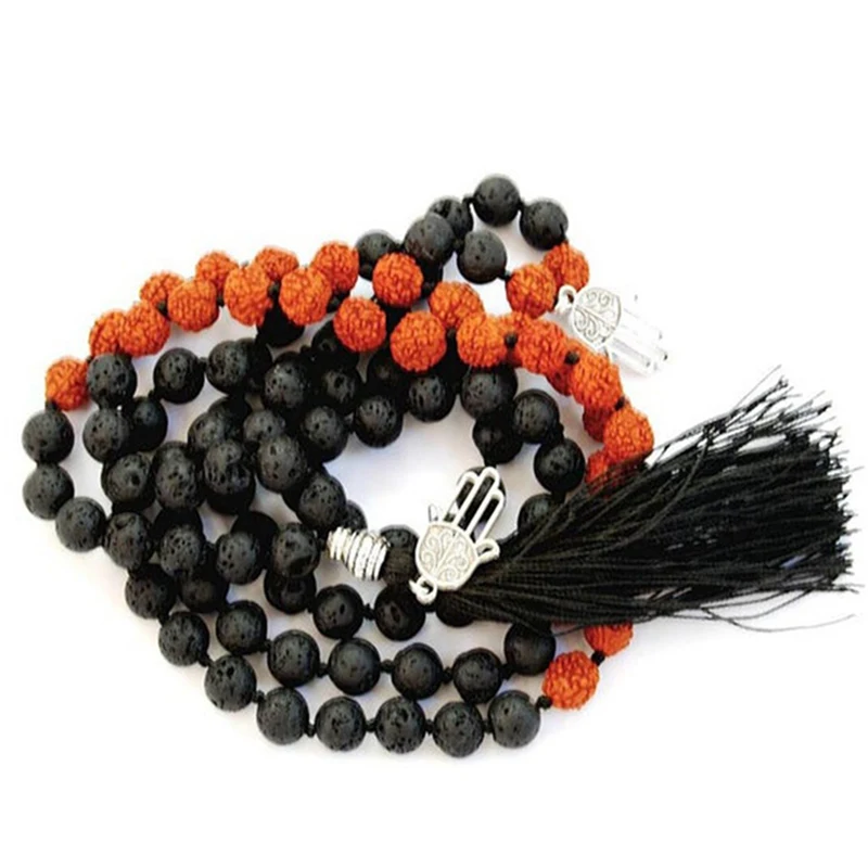 8mm Lava Stone Rudraksha 108 Beads Handmade Tassel Necklace Buddhism Chakra Classic Japa Yoga